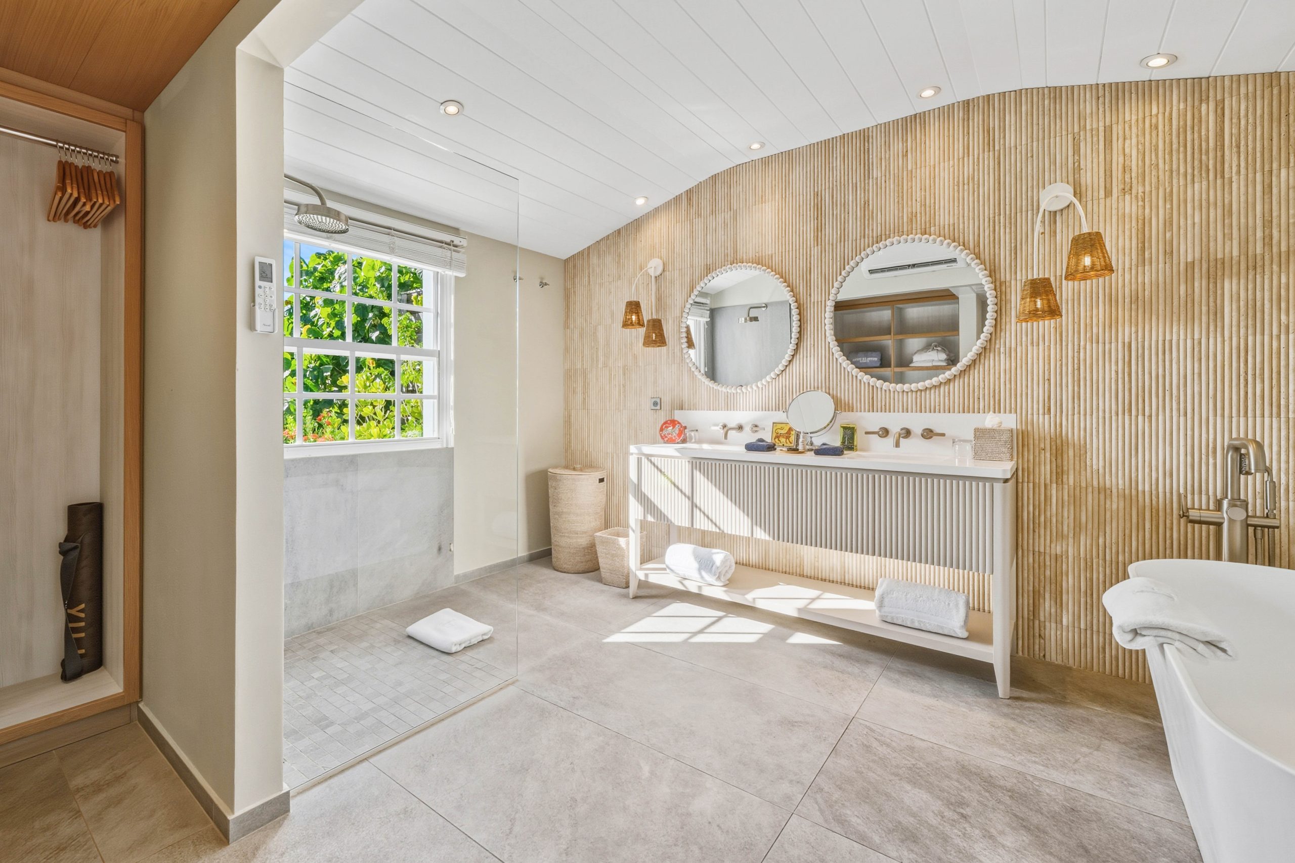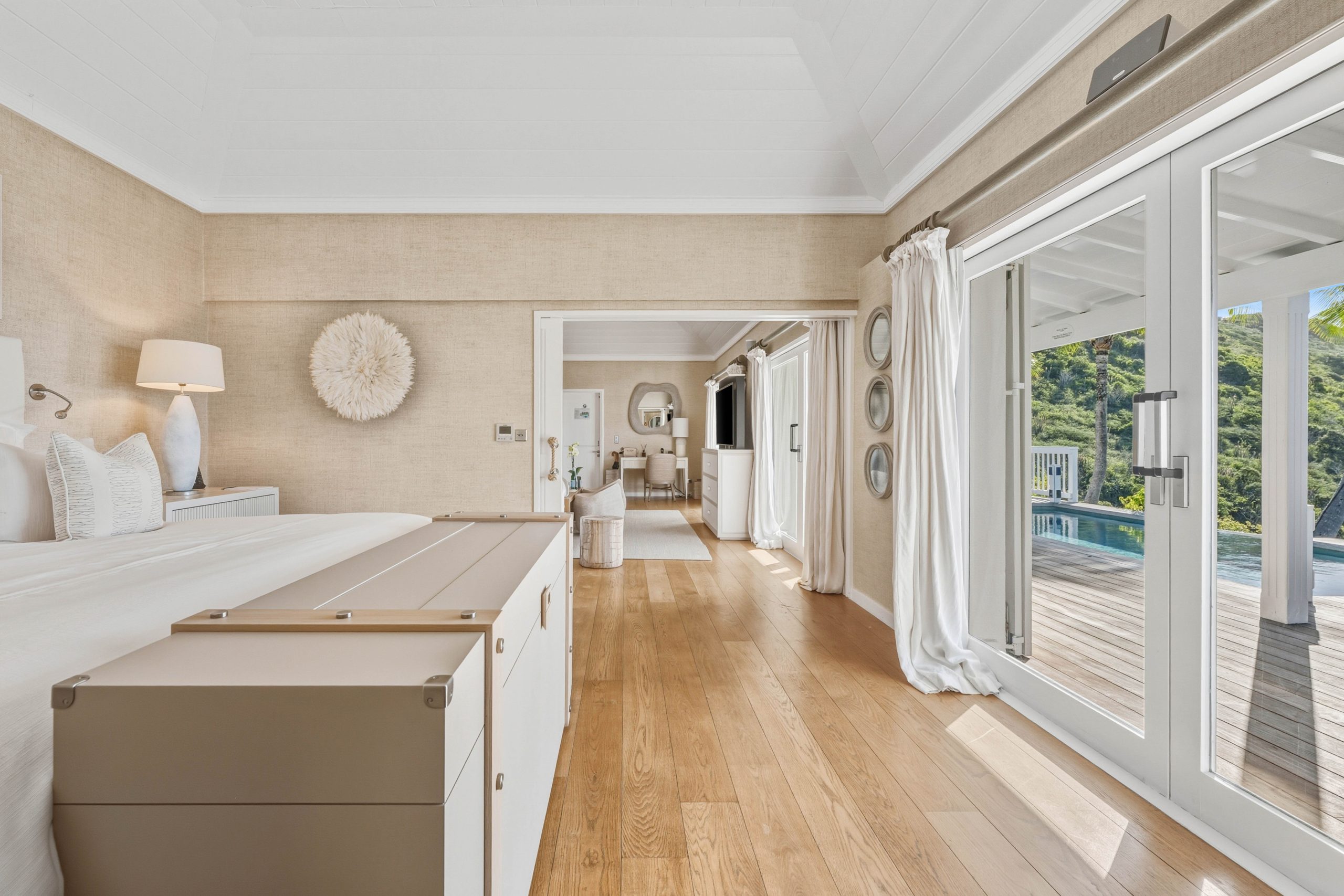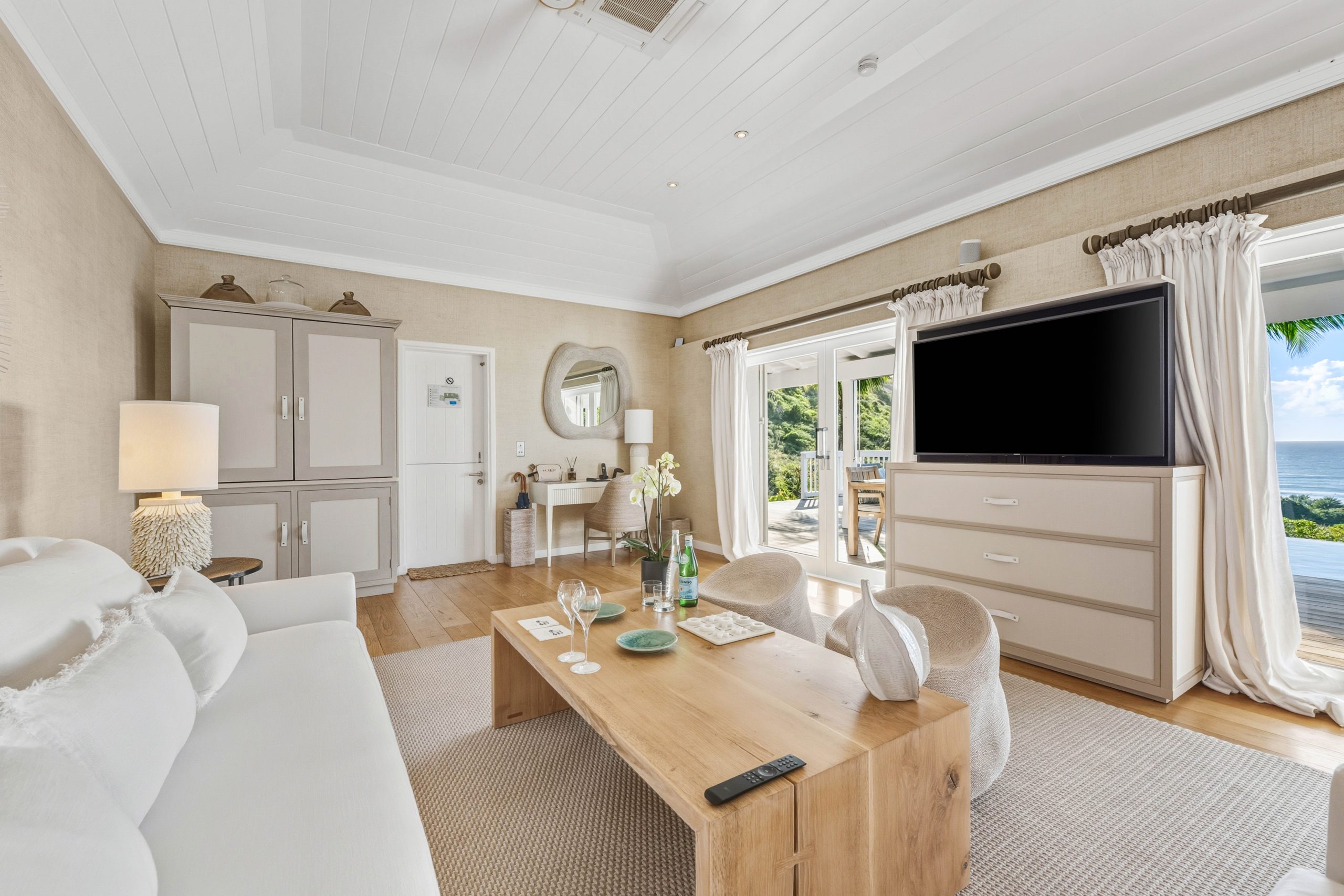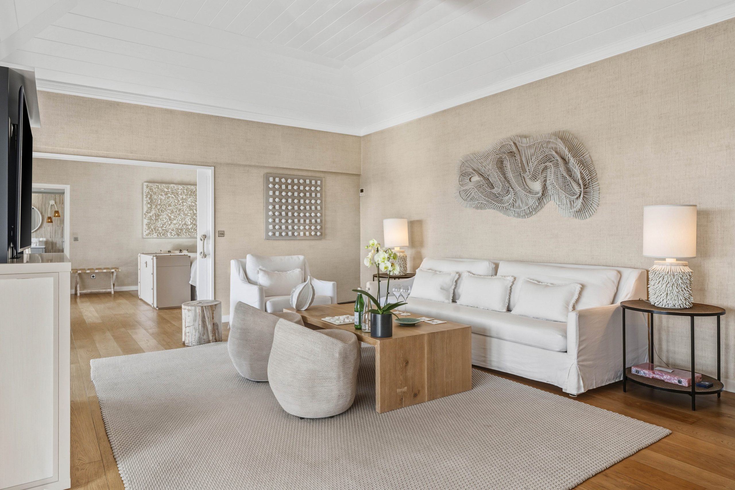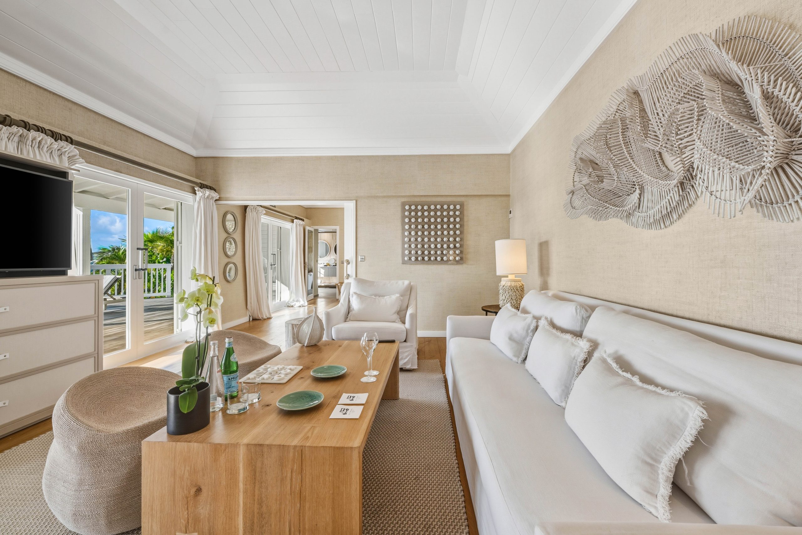 The Signature Family Suites are thoughtfully designed for families, offering both space and privacy within a refined, villa-like setting. An elegant sliding door separates the parents’ bedroom from the living area, creating a distinct space while allowing flexibility for shared moments. Full-height glass doors throughout the suite open onto uninterrupted views of the Caribbean Sea. The interior features a state-of-the-art kitchenette, a full-size sofa, bespoke stools, and an armchair. The adjoining bathroom is generously sized and includes a bathtub, separate shower, and dual vanity units. Each suite features an expansive terrace with a private pool measuring 10 × 20 feet (3 × 6 meters), as well as a private parking space for one car. An accessible suite for guests with reduced mobility is also available within this category. The living room accommodates one or two additional beds, ideal for families of up to four guests with children under the age of 16. Measuring 678 sq ft (63 m²) of interior space and 1,100 sq ft (103 m²) of total surface.
